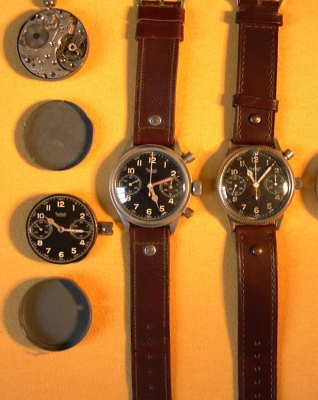 As you can see on this generally sold repro strap and the original the fastenings are entirely different. I assume but do not know that this may have been the same for 'DH' watches but as yet I have not seen one of these with an original strap. Concerning the which watch D, DH, DU etc goes where one would have to study the military passes (Wehrpass/Soldbuch)as the watches where listed therin including the number and/or information if it had actually been bought by the bearer. The two movements on the left are in their original metal factory handling cases and came from a lot discovered at a watchmaker (14). 12 of which are now with the Hanhart company ;o) ![]() | ||||