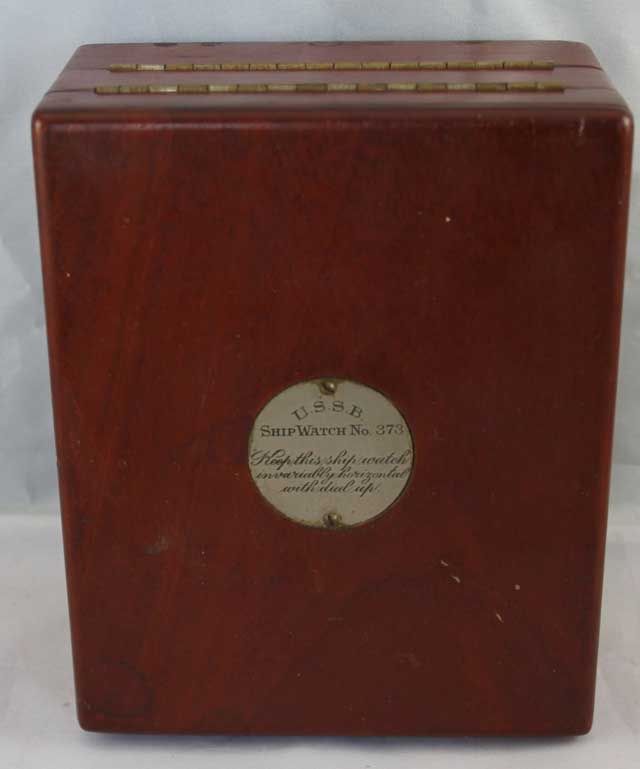 silvered plaque engraved "USSB SHIP WATCH No. 356 Keep this ship watch invariably horizontal with dial up". ***Condition: GRO (winds, sets and ticks with good motion) upper plates have two minor scratches near perimeter and light microfine scratches and the dial plate has some minor oxidation under the balance, both plates otherwise very bright. The dial is in fantastic condition and all original with no spotting and only light discoloration near 4 and 5. The original heavy gauge case shows only light wear with no dents or dings and virtually no tarnish (nicely patinated), engraving still fully visible; bow & crown show in excellent condition, good glass crystal with no chips or cracks, matching mahogany box missing key but otherwise as near mint as the rest of this "9 out of 10" watch. $3000-$4500