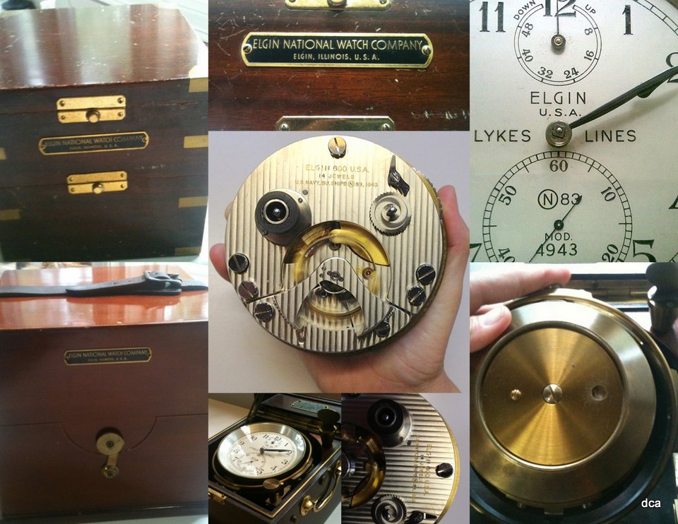Elgin Grade 600 Marine Chronometer. Elgin was the runner-up to Hamilton in the competition for the WWII military chronometer. A few Elgins were sold to the military for evaluation and the remainder were sold commercially. Supposedly a number were disposed of much later in kit form as "do it yourself" Marine Chronometers. The Elgin chronometer has a Guillaume balance with 4 arm integral form and a demountable escapement.