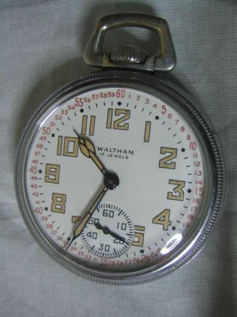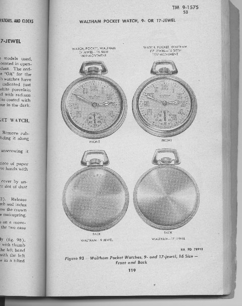 Jim HesterIt is a Waltham model 1617 pocket watch. There were two models, the 1609 which was the 9 jewel version and the 1617 which was the 17 jewel version. They were basic Army pocket watches procured by the Ordinance Department for general issue to Army soldiers and officers who needed pocket watches. Fancier models were supplied by Hamilton (a 992B 21 jewel railroad grade pocket watch) and Elgin (a 19 jewel railroad grade B.W. Raymond 372 with damascened, gold jewel setting, etc.)