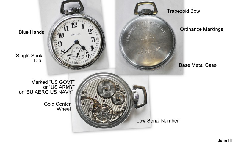 Here is one I just picked up. It is an early Hamilton 992B watch with a Type 1 movement signature marked US ARMY. The serial number of C12654 puts the production date to the beginning of WWII (1940-1941). It has blue hands and a Montgomery dial and a base metal case with ordnance markings. I believe it to be all original.
