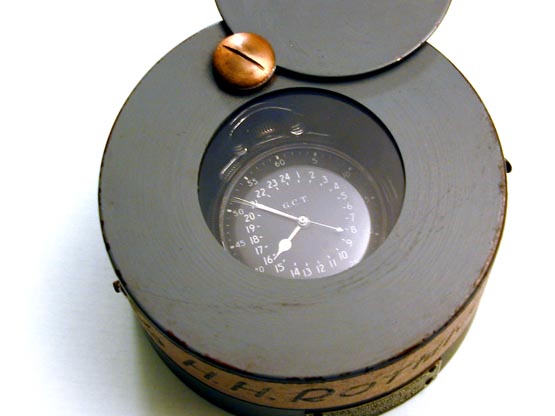 The watches were used as a master time source for the navigation of aircraft. The watches were set to Greenwich Civil Time ( thus " GCT " on the dial ) The watches were carried in a varity of ways including a rubber shock absorbing case cover, a wooden box with the watch holder suspended by cork to reduce vibrations, and in the metal tub which was designed to reduce magnetization by stray electrical currents in the airplane. Where they were carried in the aircraft would probably be determined by the type of aircraft. The book [