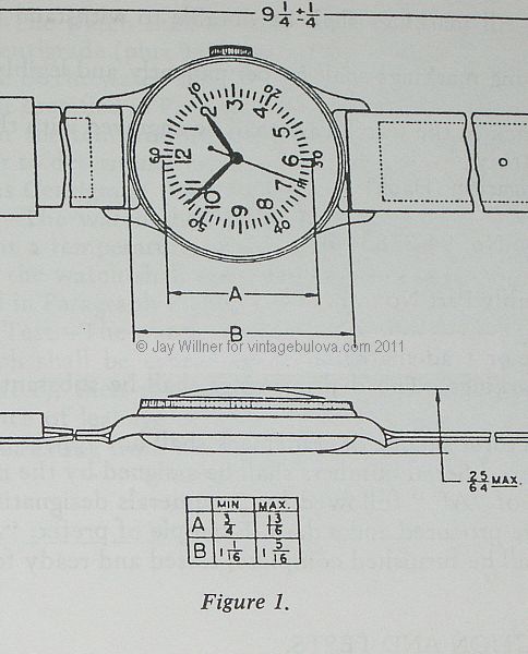 Wayne HanleyThe dimensions for my type A-11 hack watch have been authenticated. My case measures 30mm or 1 1/8 inch diameter w/o crown. 30mm is certainly within the limits 1 1/16 minimum & 1 5/16 maximum reference in mil-spec Figure 1 at the bottom of the page.