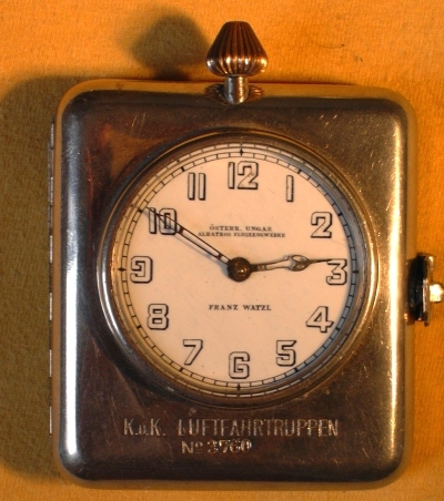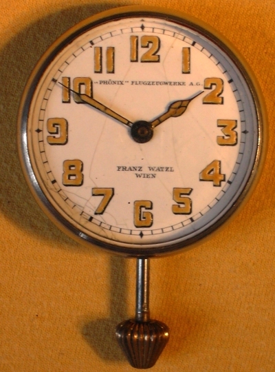 Franz Watzl Albatros instrument panel clock. Generally Austrian instrument panel clocks were mounted in the rectangular casing seen on this picture. These were inscribed K&K Luftfahrttruppen and then had a number. The dial itself was also marked with the name of the company producing the plane and generally Franz Watzl, the watch maker. I have have seen/own the following versions: