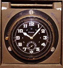 I have a question about another of your nice clocks - the 8 day clock in the wooden box. Are there any aviation service or other military kinds of markings anywhere on it? I am puzzled by the dial where the typeface of the numbers follow the shape used on French WW I aircraft clocks but the wording on the dial is in German. That seems to be a contradiction to me. I can't see the details, but my first impression is that this looks rather like some automobile clocks of the 1920s I've seen rather than an aircraft clock. Can you tell us a bit more about it and why you believe it to be an aircraft clock? Many thanks!