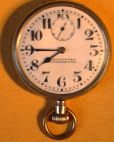 Concerning military issue watches and clocks to the army. I have not seen any. There are numerous watches and clocks in patriotric cases with patriotic dials and so forth but I have never come accross a military issued watch for the army. The Navy examples of pocket watches that I have are all marked with M numers and crowns with the exception of the J Assmann which is unmarked throughout. Airarm watches are either/or/and marked Eigentum der Fliegertruppe on the dial and either flz or fl on the back with a propeller engraving.
